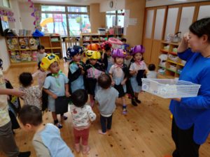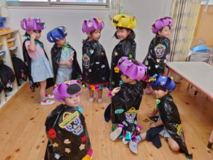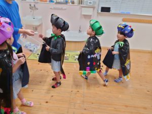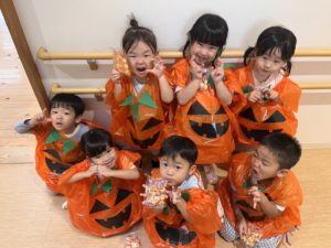 マントや被り物などを自分達で作り、当日はそれを着て仮装しました。各お部屋を「トリックオアトリート!」と言いながらお菓子をもらって大喜びの様子でした!!