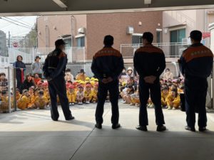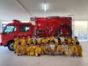 園に消防車が来ました🚒。火事の怖さをDVDで見てお勉強したり、保育教諭は消火器を使って消火訓練を行なったりしました。子ども達は、消防車の前で写真を撮ることが出来て満足気な表情をしていました(⌒∇⌒)