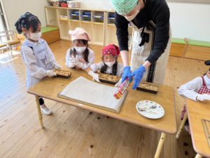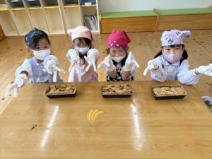 年長さんの女の子が男の子に向けてバレンタインのチョコレートを作りました。女の子たちは、完成したチョコレートを照れながら男の子に渡す姿が見受けられ微笑ましかったですよ♡