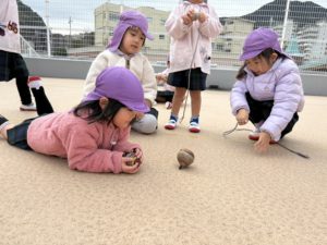 こま廻し大会がありました。日頃の保育の中でこま遊びを取り入れ、回せるようになったお友達が増えました(^▽^)。大会の日に回ったお友達は好きな景品をもらって嬉しそうでしたよ♪